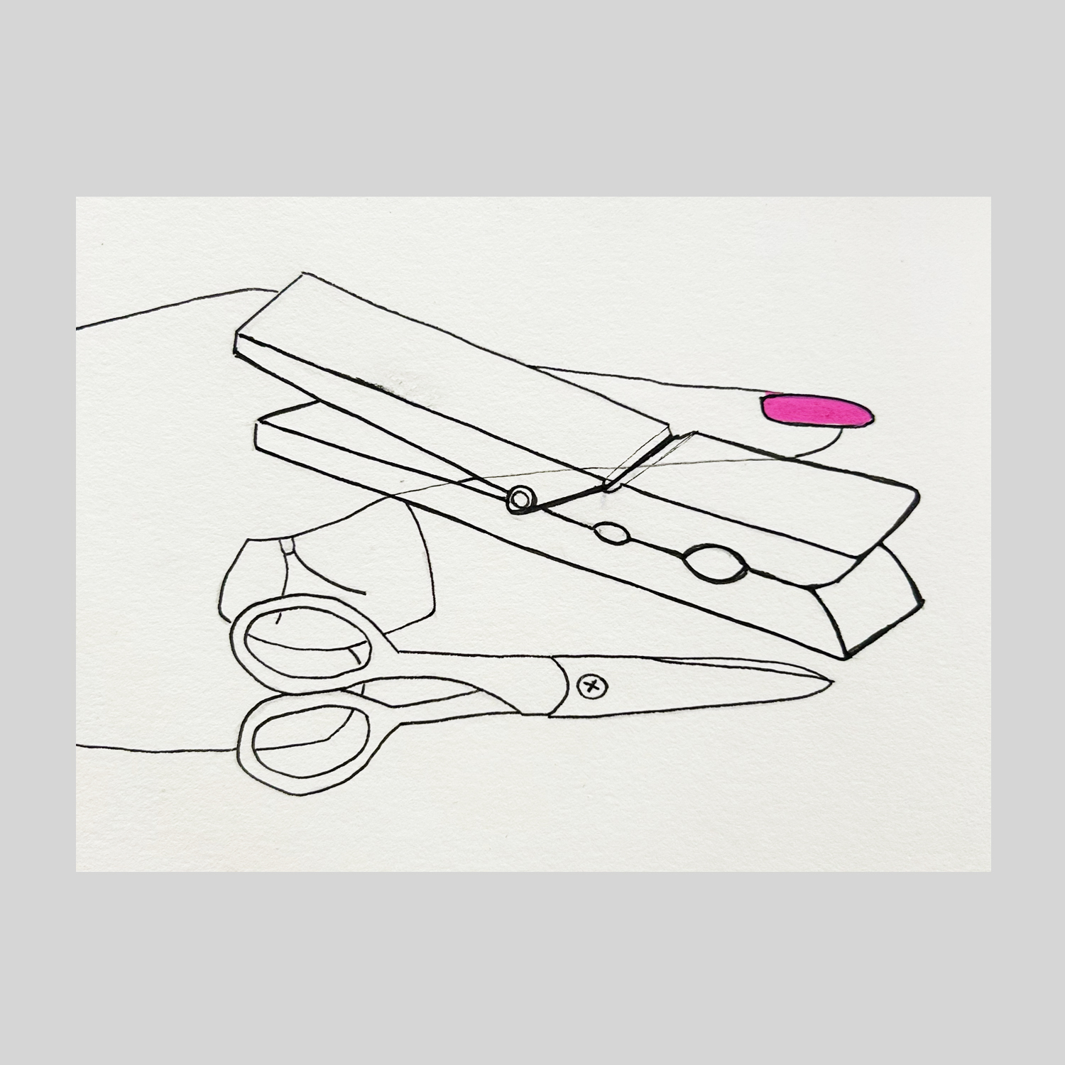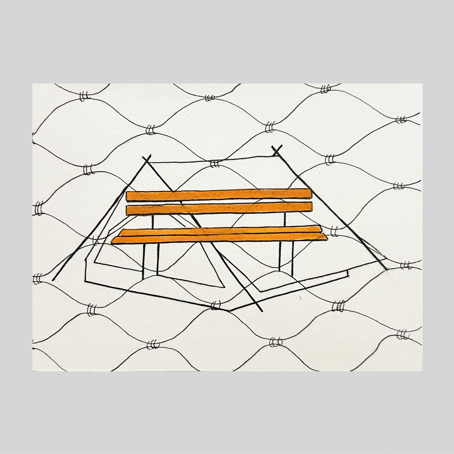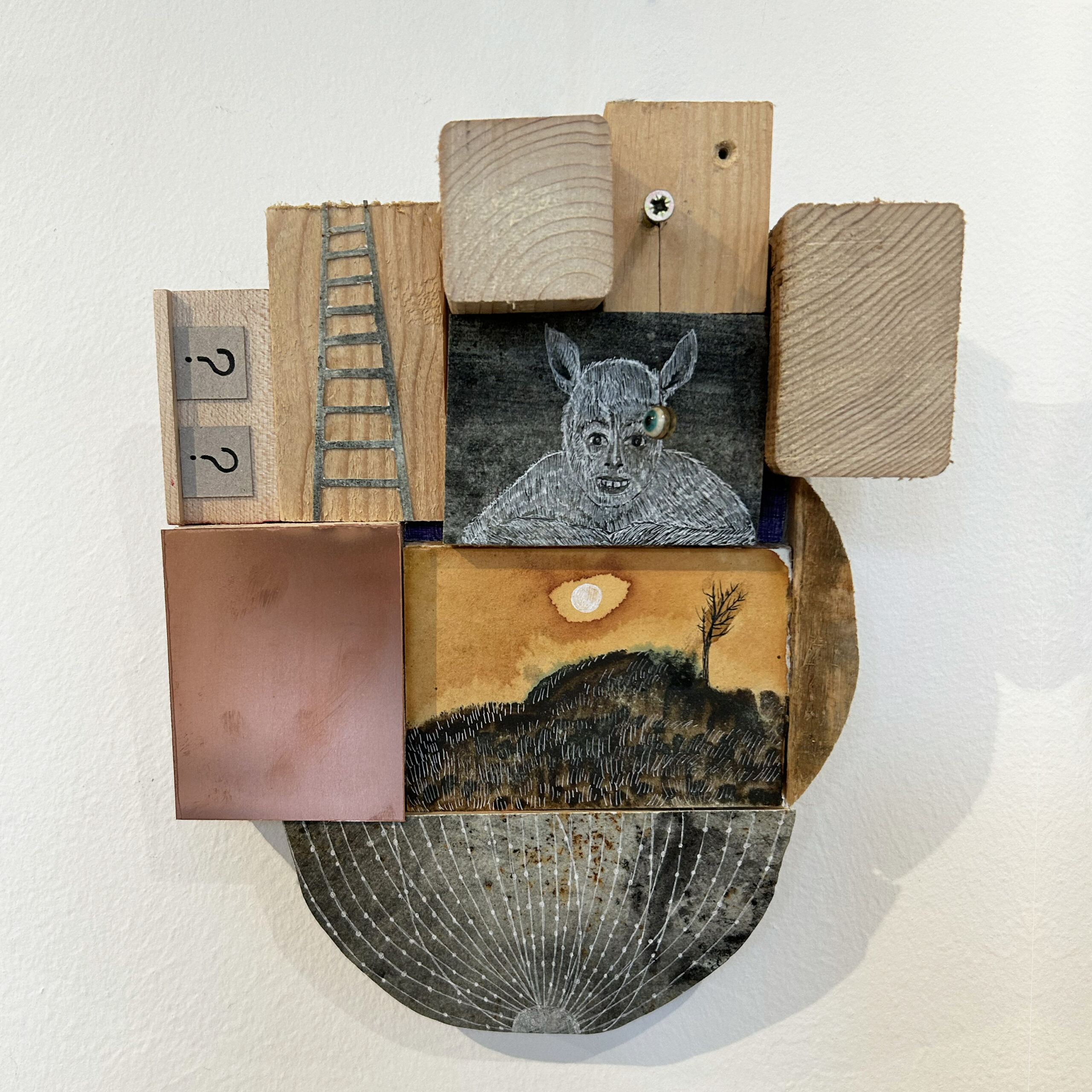 Tekeningen, koper, vloerbedekking, linoleum en houten stoeltjes gelijmd op reststukken hout.