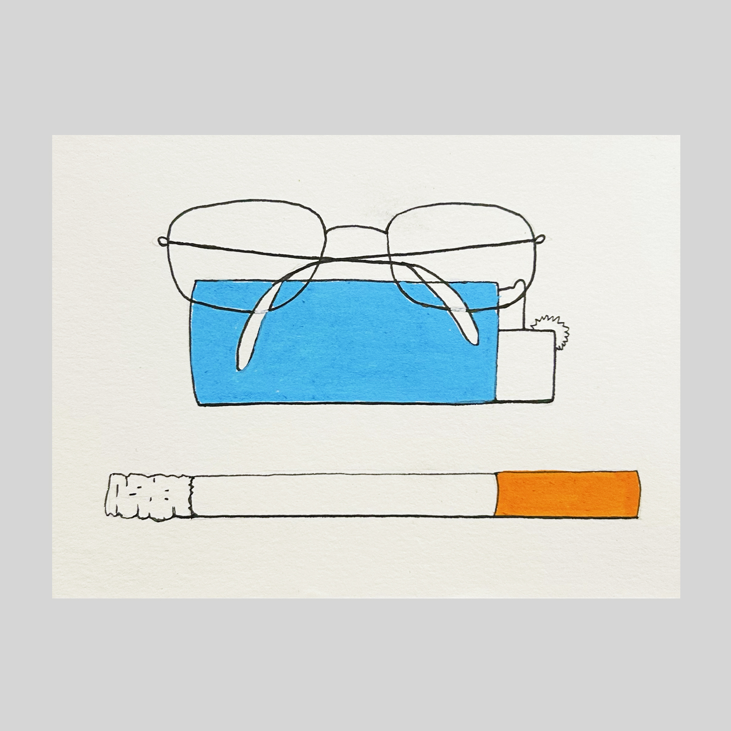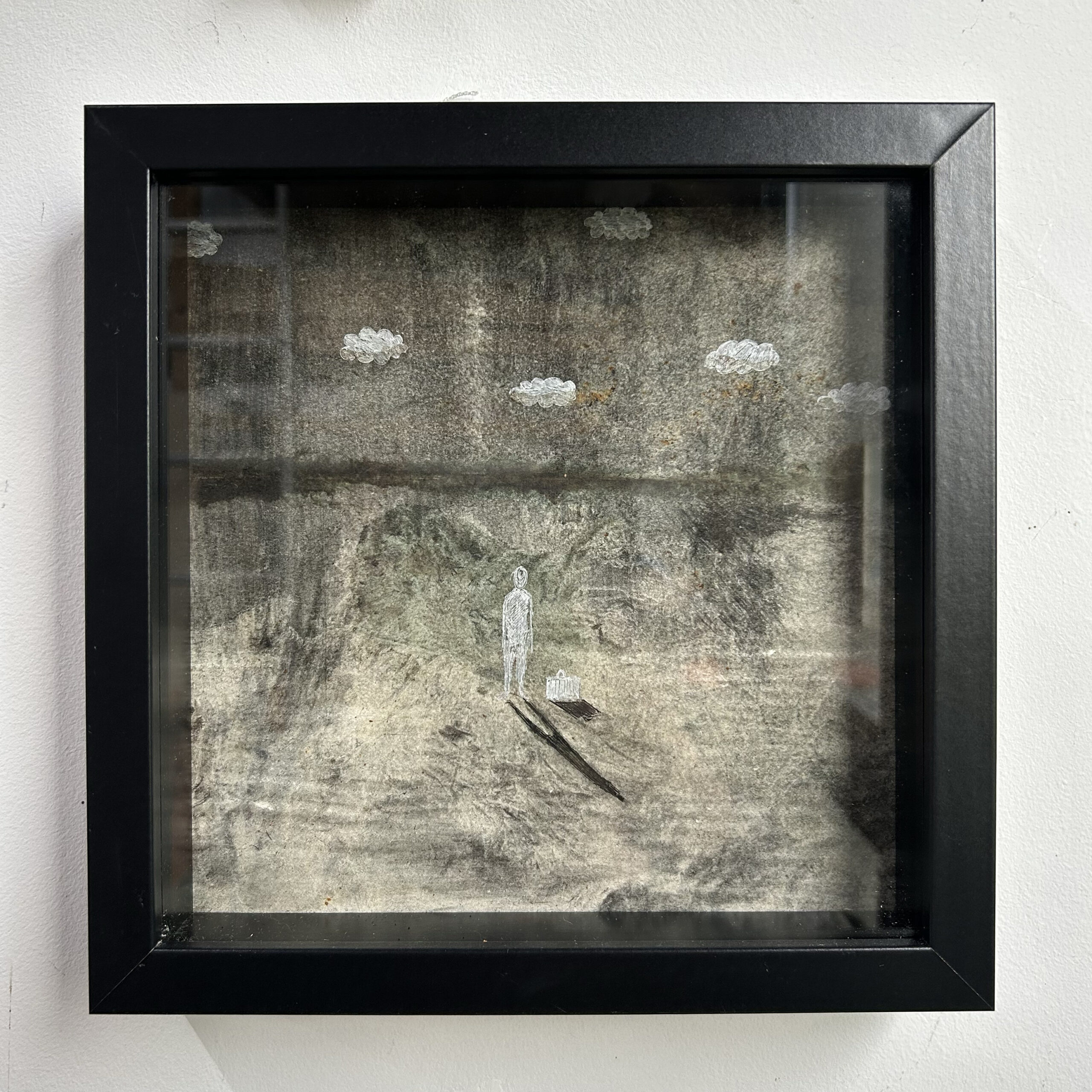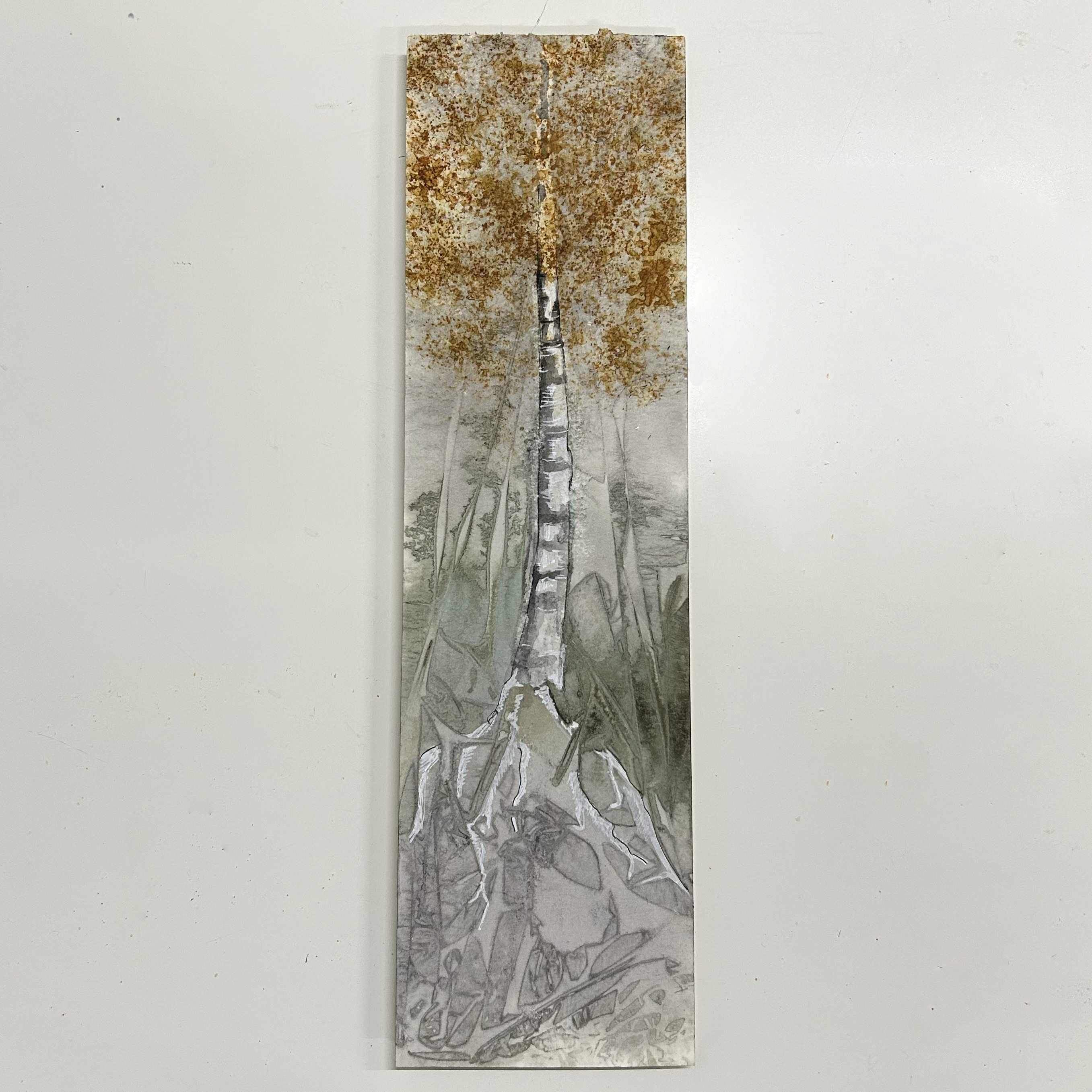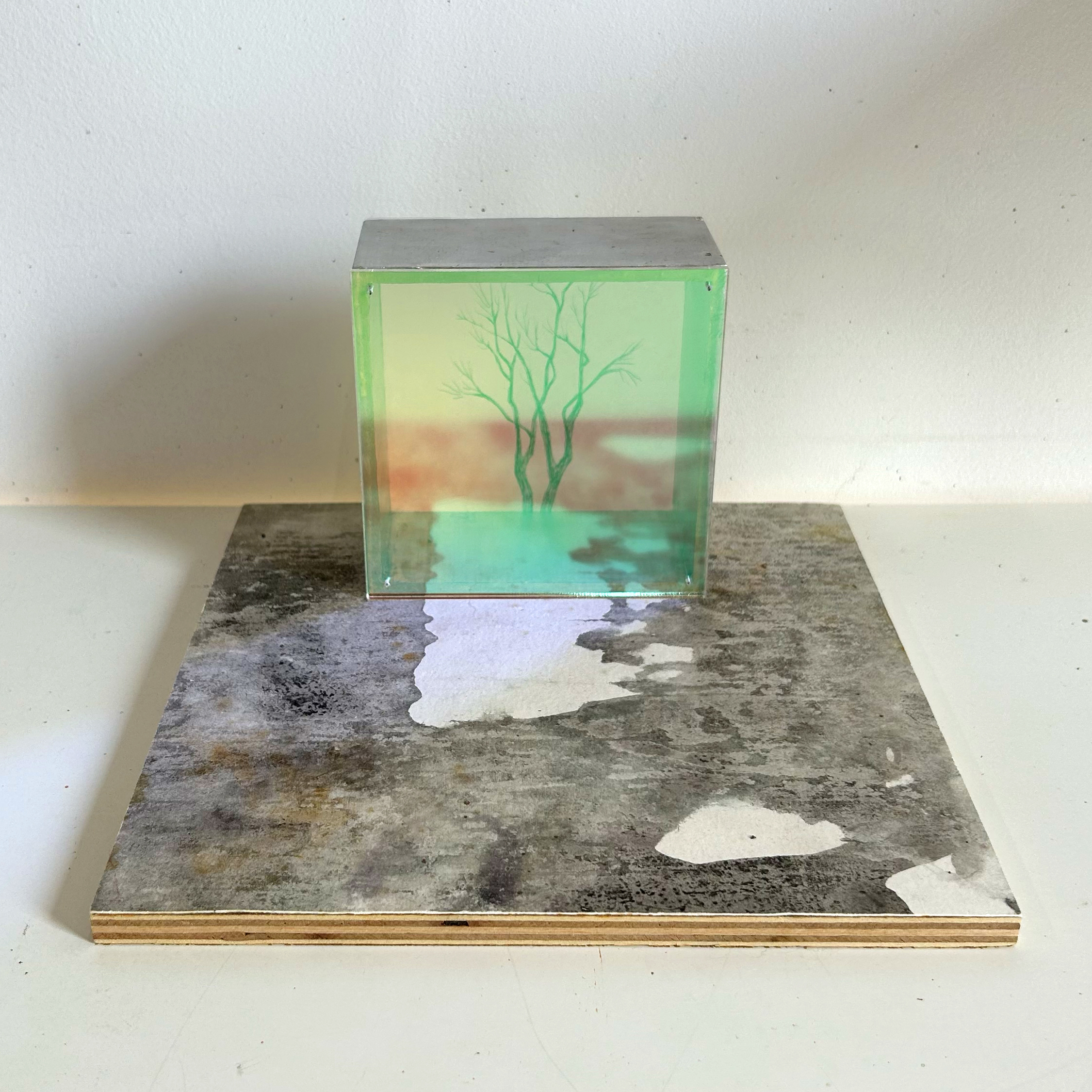 Aluminium boxje met een spiegelende laag voor en een tekening van een boom aan de achterkant. Grondplaat papier met inkttekening op multiplex gelijmd.